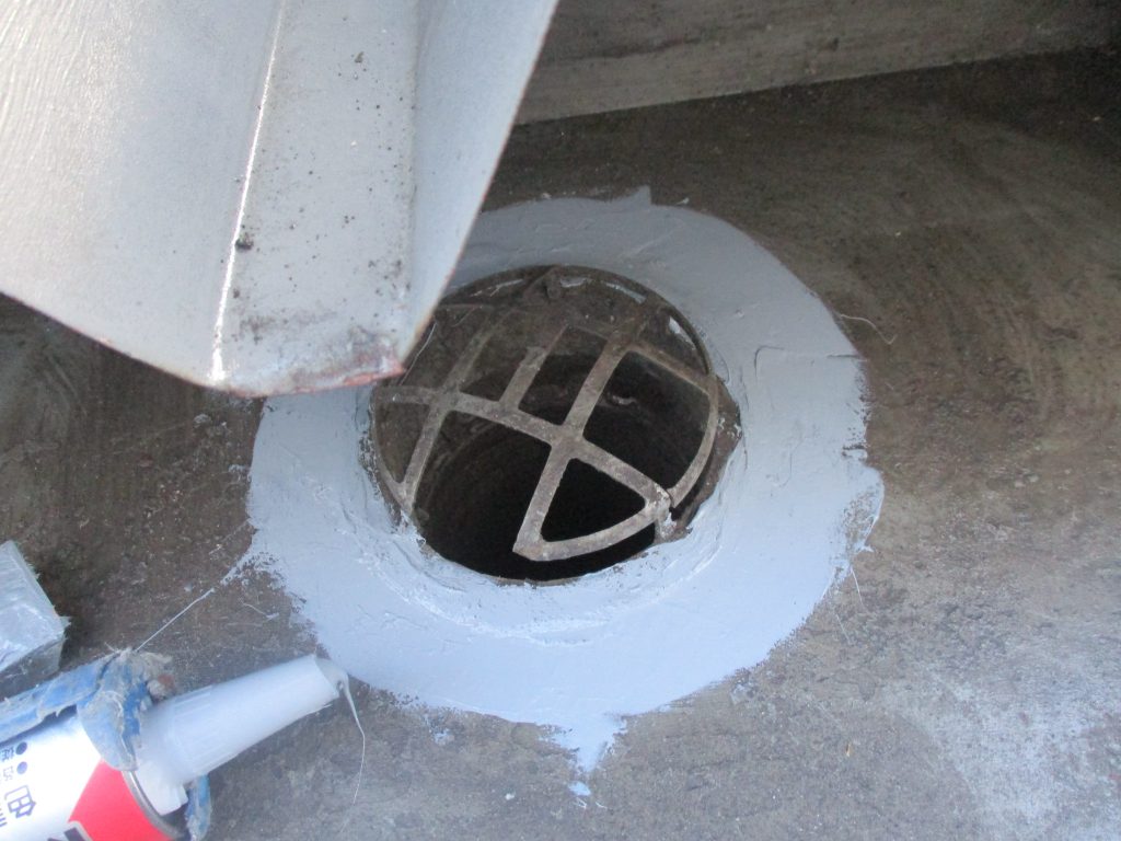 排水まわりに溜まった枯れ葉や泥をしっかり清掃してドレンまわりもしっかりシーリングで防水します。